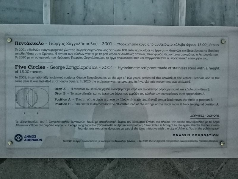 Το "Πεντάκυκλο" ζωντανεύει ξανά με αποκλειστική δωρεά του Ιδρύματος Ωνάση στο πλαίσιο της κοινής πρωτοβουλίας με τον Δήμο Αθηναίων "Τέχνη στο δημόσιο χώρο" και με τη συνεργασία του Ιδρύματος Γεωργίου Ζογγολόπουλου, το οποίο συντήρησε, απεκατέστησε και έθεσε σε πλήρη υδροκινητική λειτουργία το "Πεντάκυκλο", ένα μοναδικό έργο τέχνης - σύμβολο για την ιστορική πλατεία του κέντρου της Αθήνας.