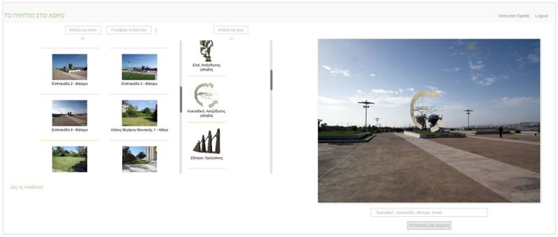 3. "Νέα σύνθεση": με απλό κλικ επιλέγω ένα από τα διαθέσιμα τοπία ή επιλέγω να ανεβάσω τη δική μου φωτογραφία τοπίου και στη συνέχεια επιλέγω το γλυπτό που με ενδιαφέρει να τοποθετήσω στη σύνθεσή μου. Στην εικόνα που δημιουργώ μπορώ να τοποθετήσω το γλυπτό στο σημείο που επιθυμώ απλώς κάνοντας drag & drop ή και να αλλάξω την κλίμακα του γλυπτού στο τοπίο κάνοντας drag to resize.