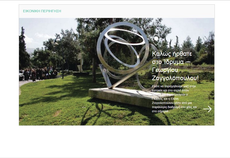 Η Εικονική Περιήγηση στο Ίδρυμα Γεωργίου Ζογγολόπουλου είναι μια εφαρμογή που δίνει τη δυνατότητα με διαδραστικό τρόπο να περιηγηθούμε στους χώρους και τις συλλογές του Ιδρύματος.