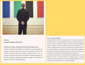 Η διάλεξη θα αποτελέσει μια προσπάθεια να αντιμετωπιστεί η δυσκολία αντίληψης και εκτίμησης του μοντέρνου έργου τέχνης, αλλά και να γίνει κατανοητή η γοητεία του. Θα εξεταστούν επιλεγμένα κομβικά έργα μοντέρνας ζωγραφικής/γλυπτικής ως προς το περιεχόμενο και την μορφή τους και θα γίνει μια αναζήτηση των κριτηρίων αξιολόγησής τους. Τέλος, θα επιχειρηθεί η περιγραφή μίας προσωπικής διαδρομής στην εξερεύνηση και αποκάλυψη της γοητείας της μοντερνιστικής τέχνης.