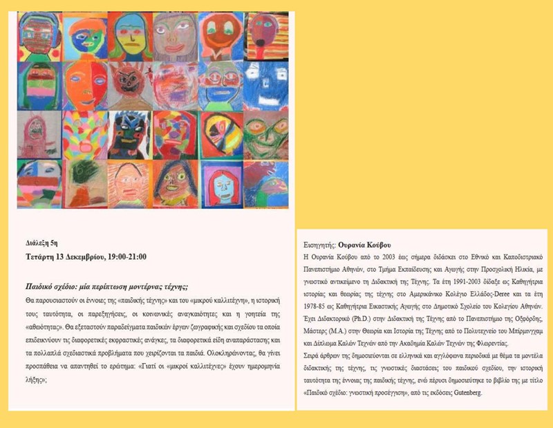 Θα παρουσιαστούν οι έννοιες της «παιδικής τέχνης» και του «μικρού καλλιτέχνη», η ιστορική τους ταυτότητα, οι παρεξηγήσεις, οι κοινωνικές αναγκαιότητες και η γοητεία της «αθωότητας». Θα εξεταστούν παραδείγματα παιδικών έργων ζωγραφικής και σχεδίου τα οποία επιδεικνύουν τις διαφορετικές εκφραστικές ανάγκες, τα διαφορετικά είδη αναπαράστασης και τα πολλαπλά σχεδιαστικά προβλήματα που χειρίζονται τα παιδιά. Ολοκληρώνοντας, θα γίνει προσπάθεια να απαντηθεί το ερώτημα: «Γιατί οι «μικροί καλλιτέχνες» έχουν ημερομηνία λήξης»;