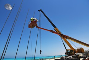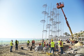 Το στήσιμο του γλυπτού έγινε κάτω από ιδιαίτερα αντίξοες συνθήκες λόγω της εξαιρετικά υψηλής θερμοκρασίας και του αμμώδους εδάφους με τη βοήθεια ενός μεγάλου γερανού και ενός καλαθοφόρου οχήματος που κολλούσαν στην άμμο χωρίς έτσι να υπάρχει η δυνατότητα της πρόσβασης περιμετρικά του γλυπτού. Οι τρεις τεχνίτες του έργου επί πέντε ημέρες εργάστηκαν αδιάκοπα για πάνω από 15 ώρες τη μέρα και συναρμολόγησαν μεθοδικά τα τμήματα που αποτελούν το γλυπτό με τη βοήθεια δεκάδων Αιγύπτιων εργατών. Η συναρμολόγηση αυτή ήταν μια σύνθετη διαδικασία δεδομένου ότι οι 15 σωλήνες, οι 40 ομπρέλες και οι 15 εγκάρσιοι άξονες που αποτελούν το γλυπτό χρειάστηκε να συναρμολογηθούν μεταξύ τους με απόλυτη ακρίβεια, άλλοτε στο έδαφος και άλλοτε σε ύψος 13 μ.
