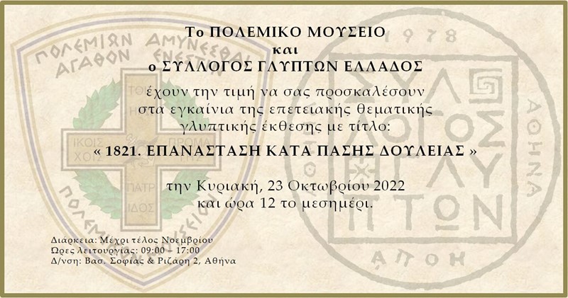 Το Πολεμικό Μουσείο και ο Σύλλογος Γλυπτών Ελλάδος με την τιμητική συμμετοχή του Ιδρύματος Γεωργίου Ζογγολόπουλου σας προσκαλούν στα εγκαίνια της ομαδικής έκθεσης γλυπτικής "1821. Επανάσταση Κατά Πάσης Δουλείας" που θα πραγματοποιηθούν στον αίθριο χώρο του Πολεμικού Μουσείου, παρουσιάζοντας 72 γλυπτά από 42 καλλιτέχνες επ΄ ευκαιρία της συμπλήρωσης 200 ετών από την έναρξη του Απελευθερωτικού Αγώνα.